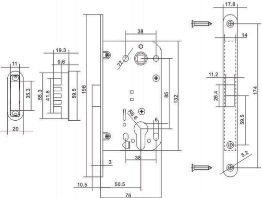 8550 (тип 410 AGB), Корпус магнитного замка с отверстием в цилиндре, Средняя защелка